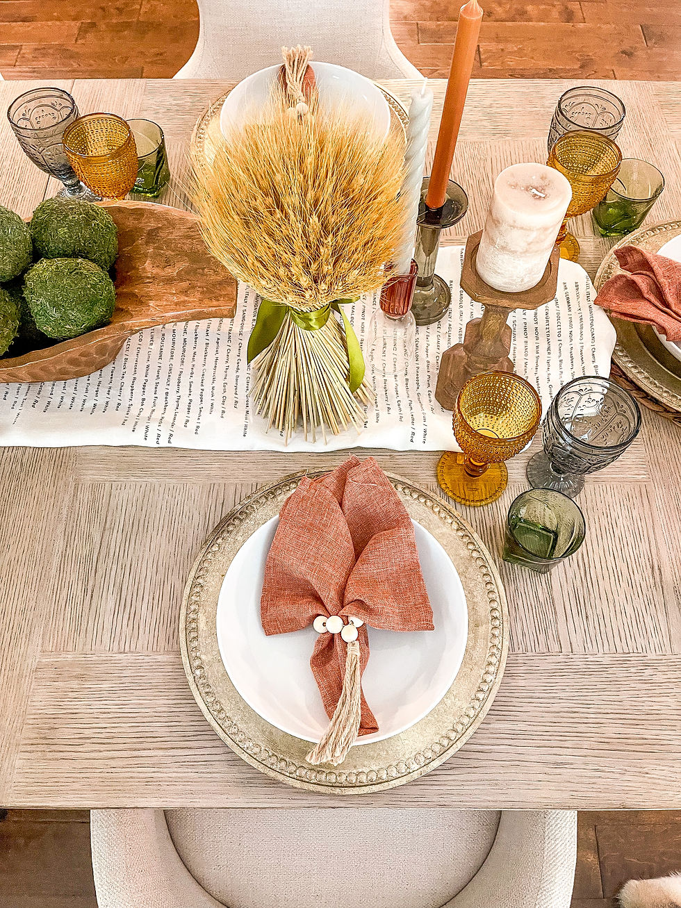 I chose some beautiful linen copper-colored napkins for the place settings, and I put the silver napkin rings in storage and brought out some wooden napkin rings to add a nice wooden contrast to all the glasses on the table.